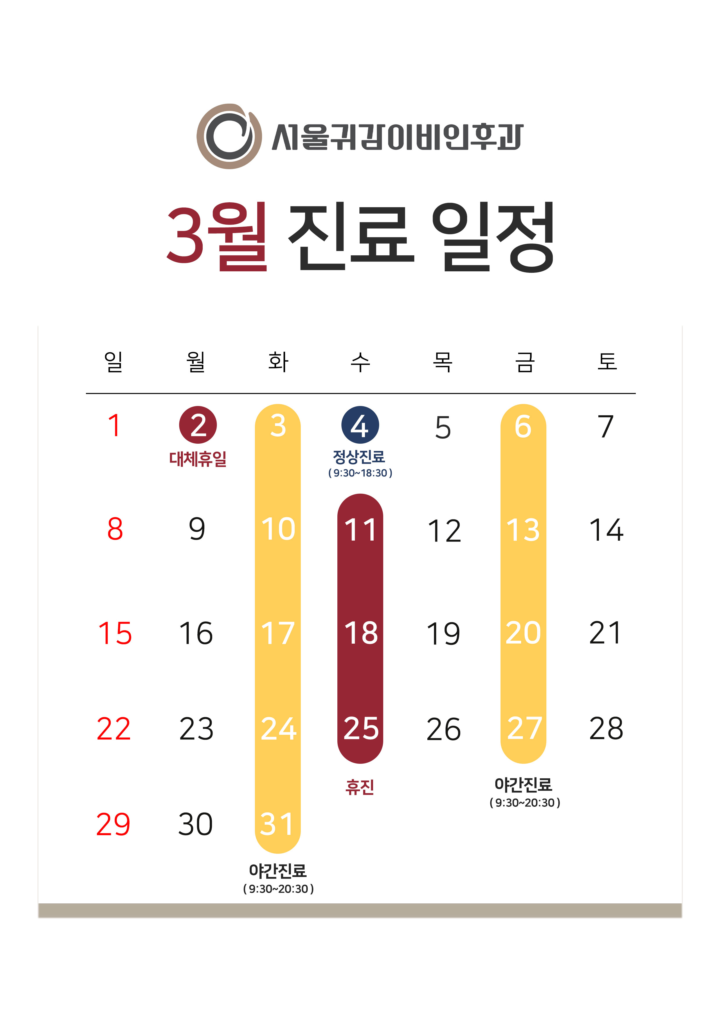 • 화요일, 금요일 AM 09:30 ~ PM 20:30(야간진료)